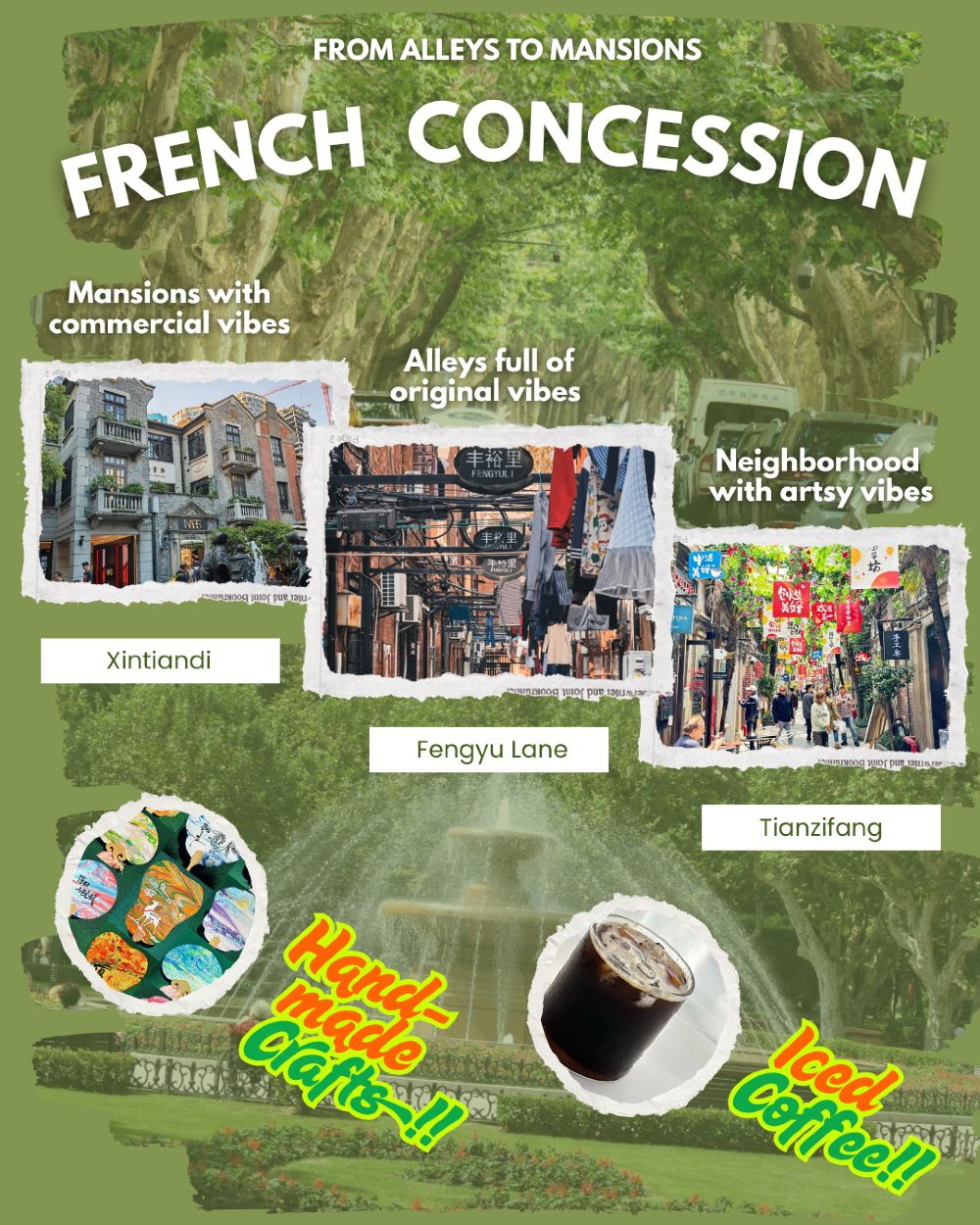 Окунитесь в атмосферу французской концессии колониальной эпохи и познакомьтесь с жизнью разных социальных классов — от традиционных переулков, где жили местные жители, до умиротворенного парка во французском стиле, когда-то доступного только для экспатов, и роскошных особняков богатых управленцев. Мы исследуем три уникальных района, каждый со своим характером — местный, современный и арт-квартал, — все они прекрасно преобразились из исторических переулков.
