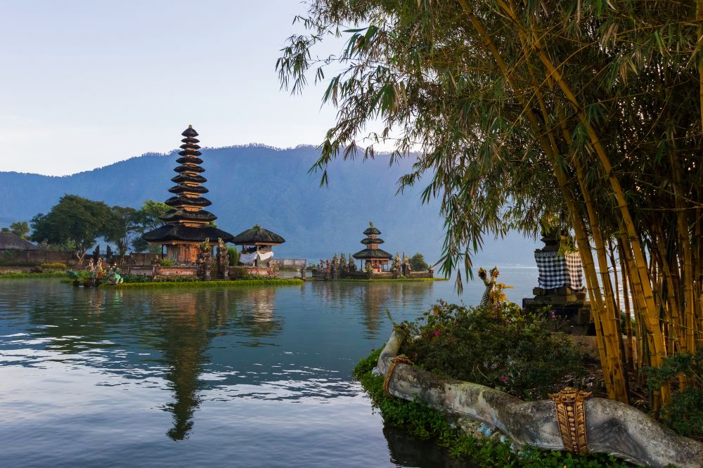 ▲Расположенный на спокойных водах озера Братан, этот шиваитский храм предлагает потрясающие виды на величественную гору Батукару.