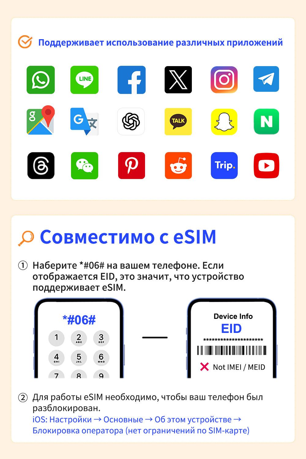 Устройство должно поддерживать функциональность eSIM: на экране набора номера наберите *#06#. Если отображается EID, устройство поддерживает eSIM. Если EID не отображается, eSIM использовать нельзя.