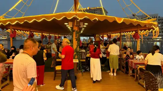 Почувствуйте теплый бриз ночного воздуха Дубая, сидя на палубе доу.