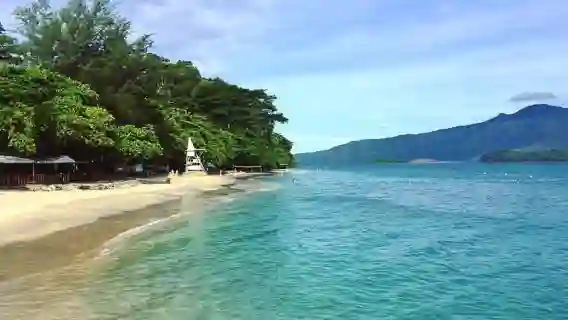 Отдохните на нетронутом пляже с белым песком, окруженном пышными тропическими лесами и кристально чистой водой.